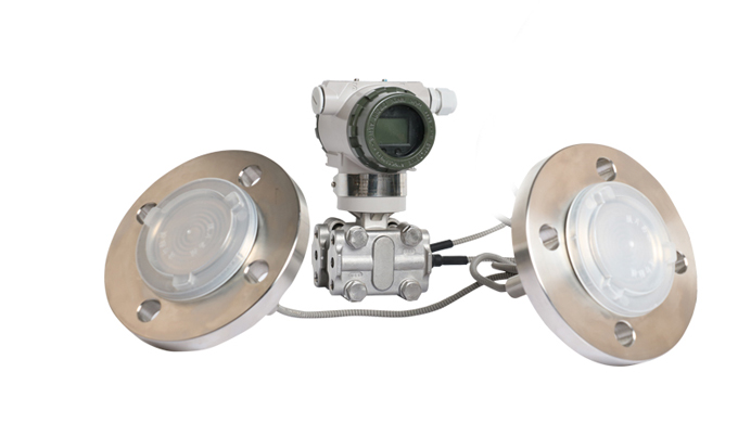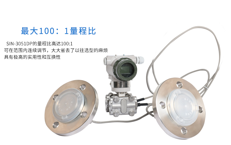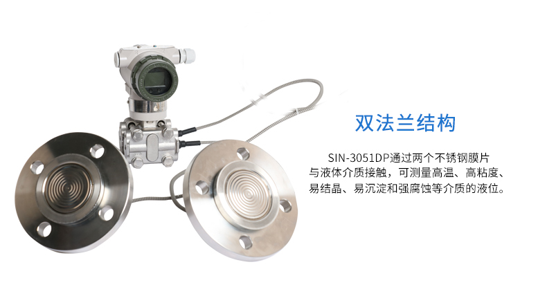 SIN-3051DP雙法蘭差壓液位變送器是一種為避免被測介質(zhì)直接作用于變送器的遠(yuǎn)傳隔離膜片接觸而采用的差壓式變送器(結(jié)構(gòu)測量法)。將變送器的測量膜片室用不銹鋼毛細(xì)管(直徑3mm左右的管子,外加保護(hù))連通道數(shù)米到數(shù)十米不等處的一個會兩個(壓力或差壓)做成法蘭形式的測量膜盒中,中間充滿傳到介質(zhì)(硅油),使用時將法蘭連接到設(shè)備,即可進(jìn)行測量。適用于需要將高溫介質(zhì)與變送器隔離;測量介質(zhì)對變送器敏感元件有腐蝕作用;被測介質(zhì)由于環(huán)境或溫度變化而固化或結(jié)晶;更換被測介質(zhì)需要嚴(yán)格凈化測量頭;懸浮液體或高粘度介質(zhì);測量頭要保持清潔衛(wèi)生;密封壓力容器測量。